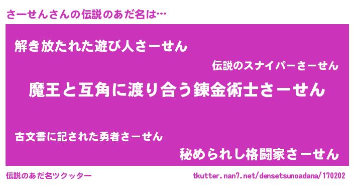| ヒーロー風カッコイイあだ名 | 『愛の使者さーせん』『仮面サーダー』 |