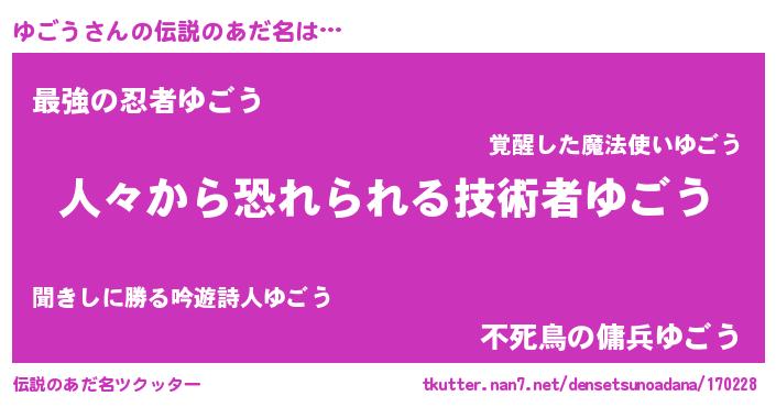 | ポケモン風あだ名 | 『ユゴゴンZ』『ユックウザ』 |