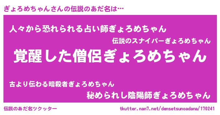 | 男性向けラノベタイトル風あだ名 | 『Re:ぎょろめちゃんから始める異世界生活』 |