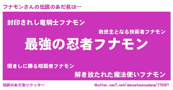 | ヒーロー風カッコイイあだ名 | 『ウルトラフナモンマン』『黄金騎士フナ』 |