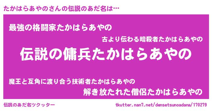 | 女子向けラノベタイトル風あだ名 | 『(仮)たかはらあやののやんごとなき事情』 |