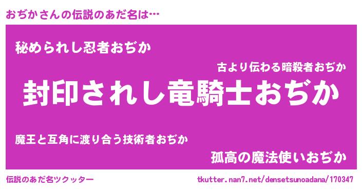 | 胡散臭い通販商品みたいなあだ名 | 『あなたにだけ特別に提供する100年もののヴィンテージワイン…その名も「おぢか」』 |