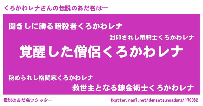 | 男性向けラノベタイトル風あだ名 | 『くろかわレナの嫁は女の子じゃないと思った?』 |