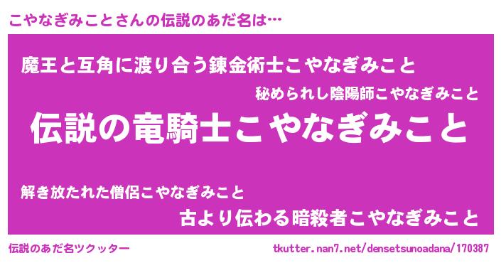 | ヘコむあだ名 | 『こやふぇ~』『こやなぎみこと(遠い目)』 |