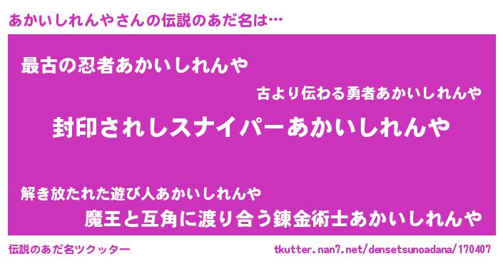 | 男性向けラノベタイトル風あだ名 | 『アカイシレンヤアートオンライン』 |
