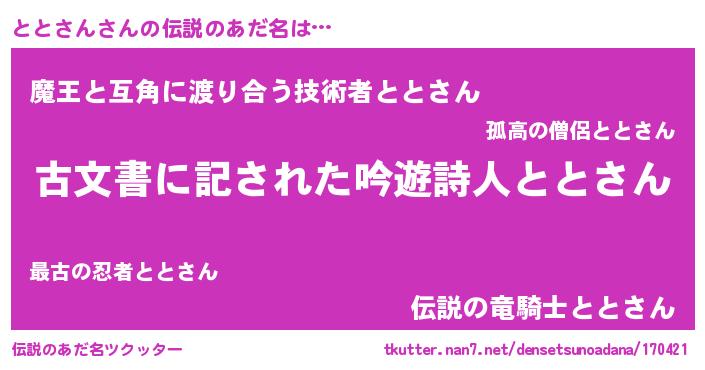 | ヒーロー風カッコイイあだ名 | 『ネオトトサン』『仮面トトダー』 |