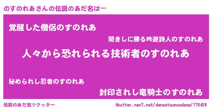 | ヒーロー風カッコイイあだ名 | 『正義の使者のすのれあ』『炎刃騎士ノス』 |