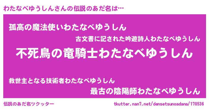 | 男性向けラノベタイトル風あだ名 | 『転生したらわたなべゆうしんだった件』 |