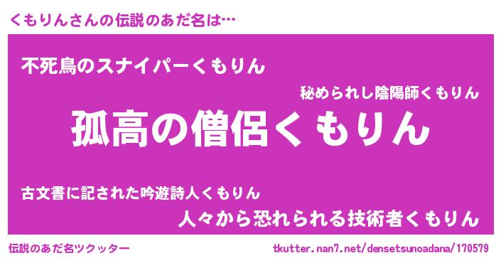 | 男性向けラノベタイトル風あだ名 | 『ダンジョンにくもりんを求めるのは間違っているだろうか』 |