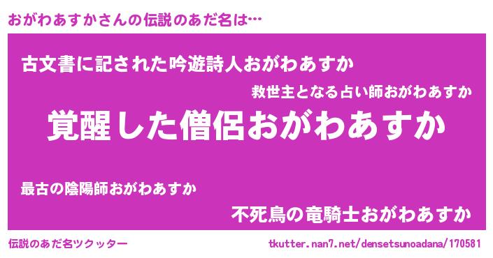 | 意味不明あだ名 | 『とにかく怪しいおがわあすか』 |