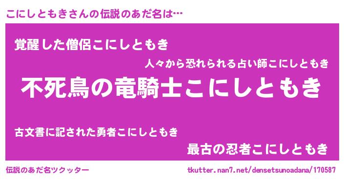 | 女子向けラノベタイトル風あだ名 | 『こにしともき姫と円卓の騎士』 |