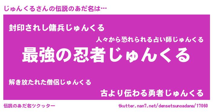 | 男性向けラノベタイトル風あだ名 | 『Re:じゅんくるから始める異世界生活』 |