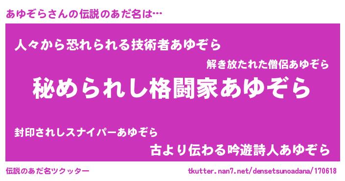 | ヒーロー風カッコイイあだ名 | 『ウルトラあゆぞらマン』『仮面アユダー』 |