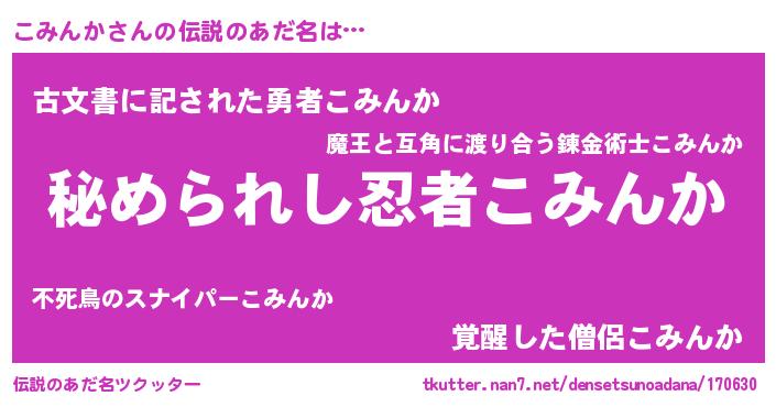 | 意味不明あだ名 | 『めかぶ科こみんか属』『自称こみんか』 |