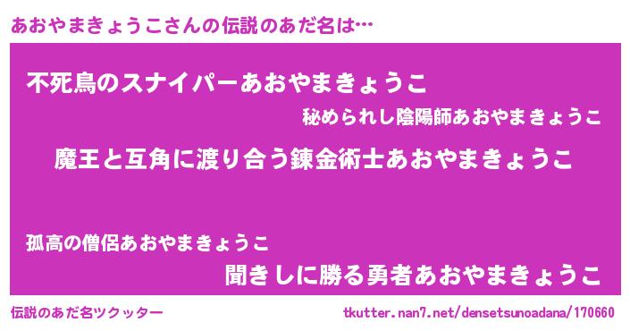 | 女子向けラノベタイトル風あだ名 | 『あおやまきょうこ恋絵巻』 |