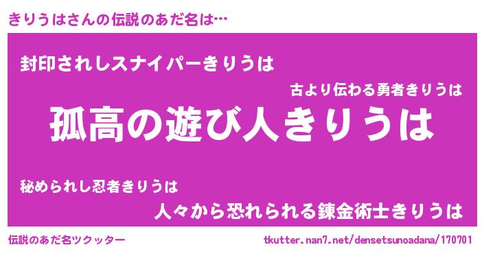 | ヒーロー風カッコイイあだ名 | 『仮面キリダー』『銀牙騎士キリ』 |