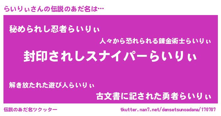 | 意味不明あだ名 | 『ペロリンらいりぃ』『自称らいりぃ』 |