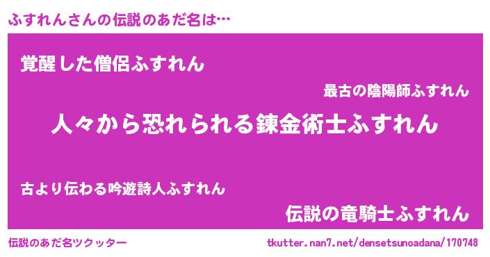 | 男性向けラノベタイトル風あだ名 | 『魔弾の王とふすれん』『ふすれんの憂鬱』 |