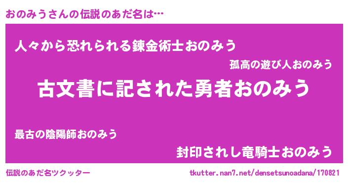 | ヒーロー風カッコイイあだ名 | 『仮面オノダー』『ネオオノミウ』 |
