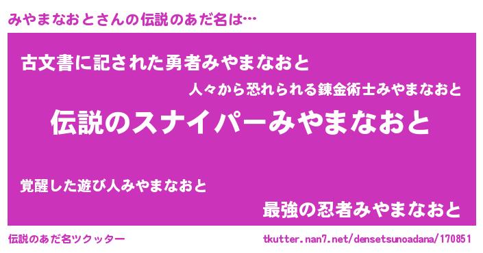 | 胡散臭い通販商品みたいなあだ名 | 『必ず成功する霊験あらたかなお札…その名も「みやまなおと」』 |