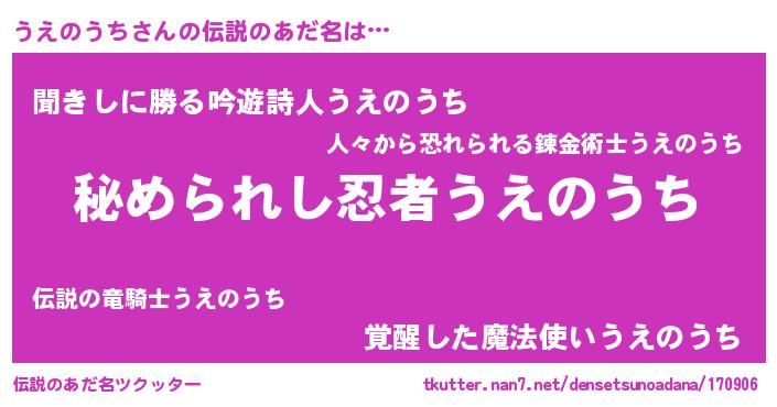 | 男性向けラノベタイトル風あだ名 | 『ウエノウチスレイヤー』 |