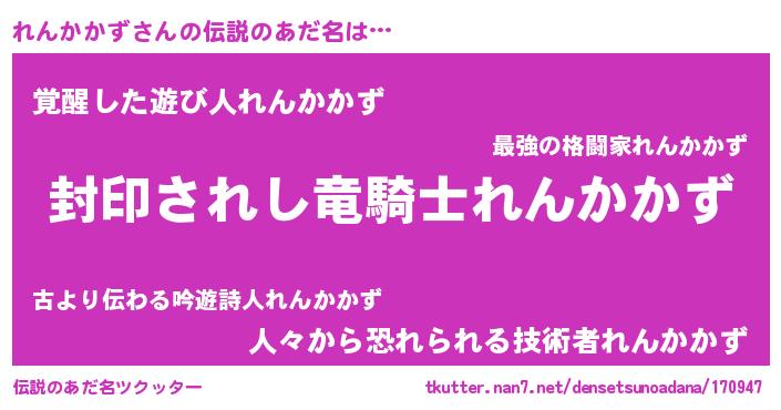 | 男性向けラノベタイトル風あだ名 | 『れんかかずに滅ぼされるだけの簡単なお仕事です』 |