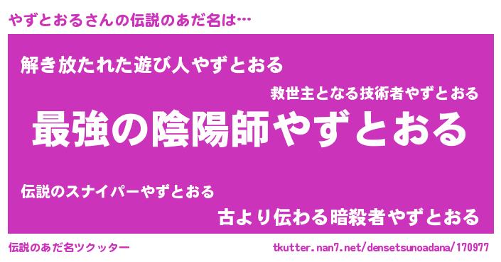 | 男性向けラノベタイトル風あだ名 | 『やずとおる~年齢イコール彼女いない歴の魔法使い~』 |