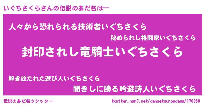 | ヘコむあだ名 | 『いぐにー』『いぐちさくら(小並感)』 |