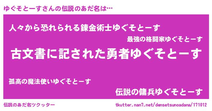 | 男性向けラノベタイトル風あだ名 | 『ゆぐそとーす~年齢イコール彼女いない歴の魔法使い~』 |