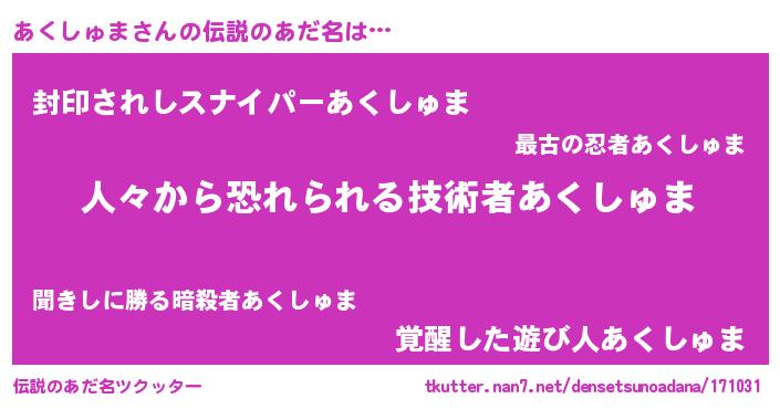 | ヒーロー風カッコイイあだ名 | 『仮面アクダー』『天空の使者あくしゅま』 |