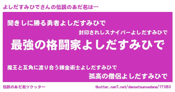 | 男性向けラノベタイトル風あだ名 | 『よしだすみひで~年齢イコール彼女いない歴の魔法使い~』 |