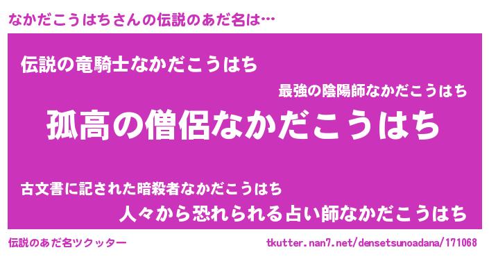 | 男性向けラノベタイトル風あだ名 | 『ダンジョンになかだこうはちを求めるのは間違っているだろうか』 |