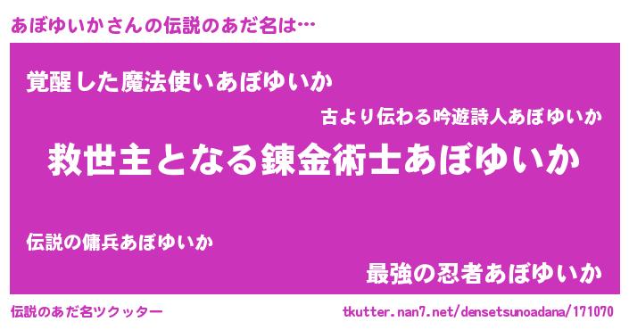 | 欧米人風あだ名 | 『あぼゆいか・ステッグマイヤー』 |
