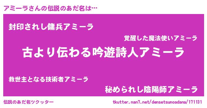 | 男性向けラノベタイトル風あだ名 | 『アミーラという概念が存在しない退屈な世界 』 |