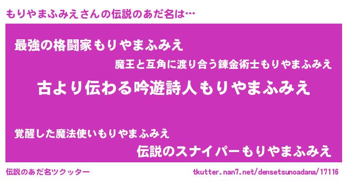 | 意味不明あだ名 | 『永久保存もりやまふみえ』 |