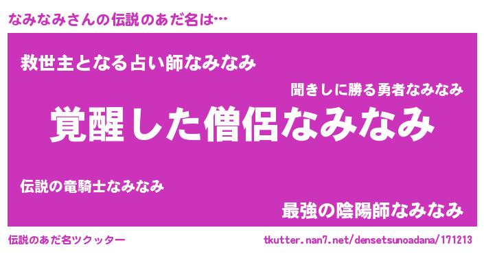 | 男性向けラノベタイトル風あだ名 | 『なみなみの嫁は女の子じゃないと思った?』 |