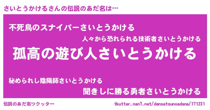 | ヒーロー風カッコイイあだ名 | 『暗黒騎士サイ』『ネオサイトウカケル』 |