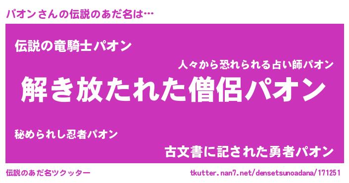 | 男性向けラノベタイトル風あだ名 | 『ダンジョンにパオンを求めるのは間違っているだろうか』 |