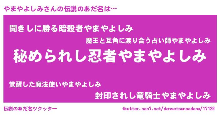 | 男性向けラノベタイトル風あだ名 | 『やはりやまやよしみの青春ラブコメはまちがっている 』 |