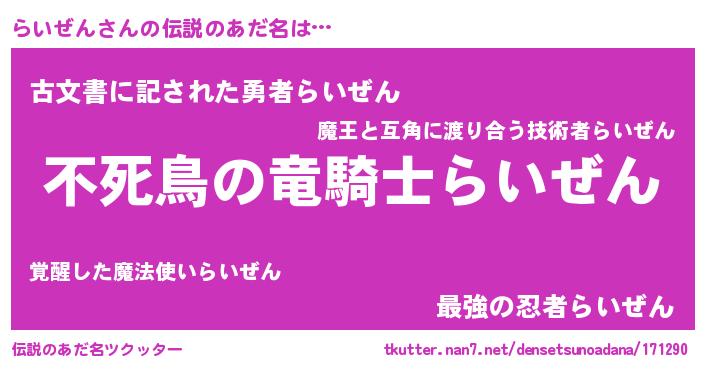 | 女子向けラノベタイトル風あだ名 | 『らいぜん姫と円卓の騎士』 |
