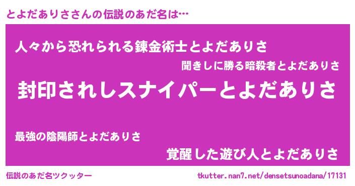 | ヒーロー風カッコイイあだ名 | 『スーパートヨダアリサ』『幻影騎士トヨ』 |