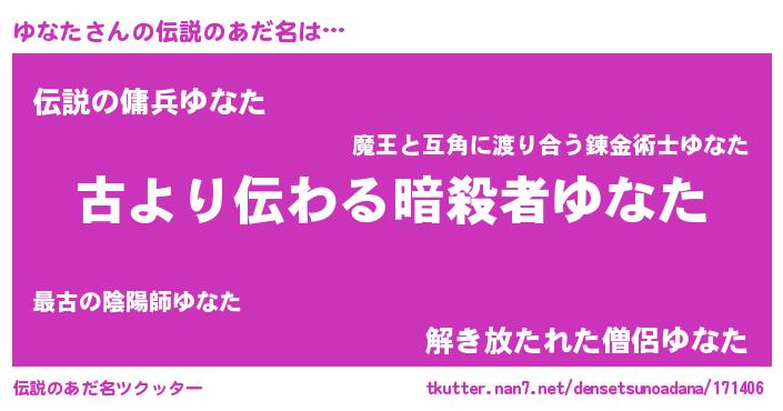 | 男性向けラノベタイトル風あだ名 | 『ゆなたという概念が存在しない退屈な世界 』 |
