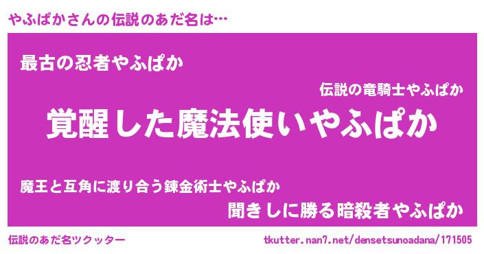 | 男性向けラノベタイトル風あだ名 | 『やふぱかの嫁は女の子じゃないと思った?』 |