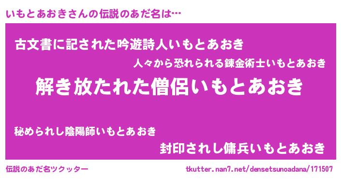 | 男性向けラノベタイトル風あだ名 | 『いもとあおきの嫁は女の子じゃないと思った?』 |