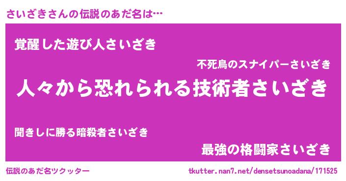 | 男性向けラノベタイトル風あだ名 | 『緋弾のサイザキ』『魔弾の王とさいざき』 |