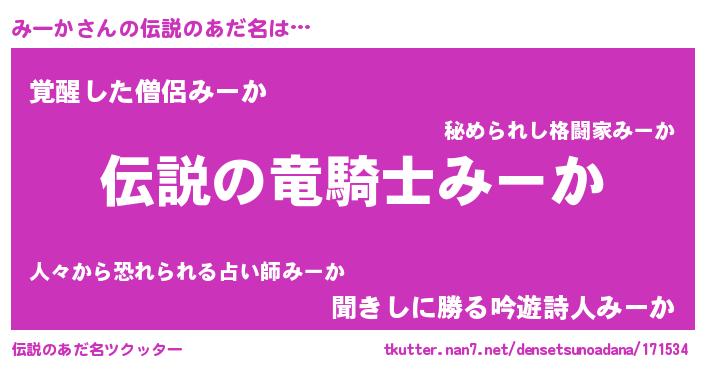 | 男性向けラノベタイトル風あだ名 | 『みーかの憂鬱』『魔弾の王とみーか』 |
