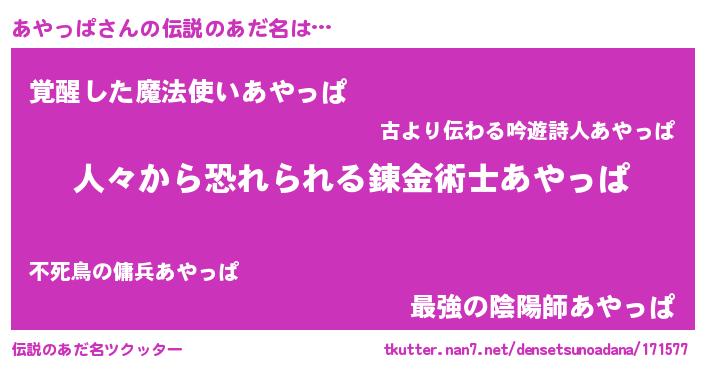 | ヒーロー風カッコイイあだ名 | 『正義の使者あやっぱ』『幻影騎士アヤ』 |