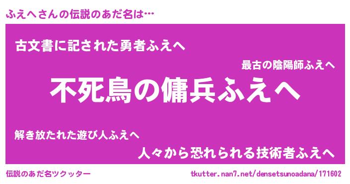 | 女子向けラノベタイトル風あだ名 | 『ふえへ姫と円卓の騎士』『ふえへ恋絵巻』 |