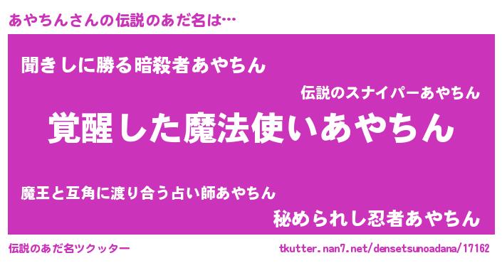 | ヒーロー風カッコイイあだ名 | 『天弓騎士アヤ』『ネオアヤチン』 |