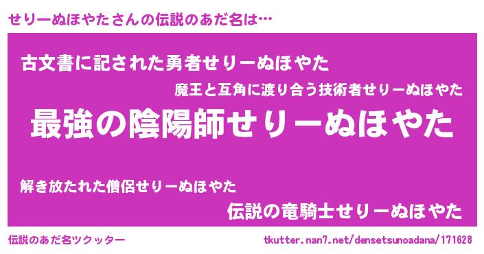| 肩書あだ名 | 『せりーぬほやた総統』 |